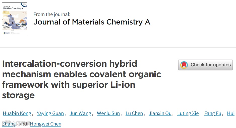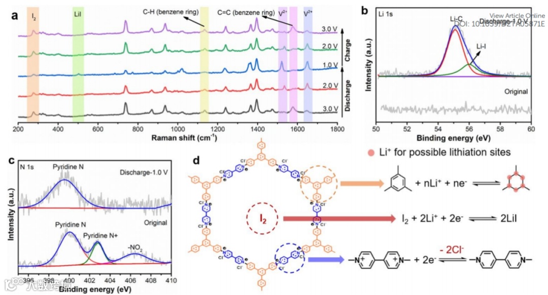 基于此,来自华侨大学的陈宏伟课题组在Journal of Materials Chemistry A期刊发表题为“Intercalation-conversion hybrid mechanism enables covalent organic framework with superior Li-ion storage”的研究论文。该论文选用紫精单元与苯环构成COF骨架,并在其孔结构内部吸附I2,将插层与转换储锂机制集于一身的同时,实现了COF结构的最大化的利用。
