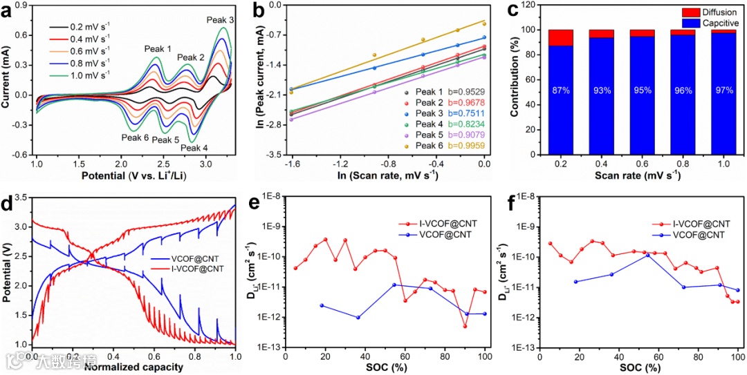 将I-VCOF@CNT材料制成电极,与金属锂负极匹配构筑锂离子电池,对其储锂性能进行了表征。结果表明,I-VCOF@CNT表现出更高的比容量、优异的倍率性能(10 C电流密度下,容量为248 mAh g-1)和卓越的长循环稳定性(1 C电流密度下循环800圈后,容量保持外338 mAh g-1),其性能远优于未吸附I2的VCOF@CNT材料。结合不同扫速下的CV曲线和GITT曲线分析其动力学可知,I2的引入可以显著提高VCOF@CNT正极的赝电容占比,并且其锂离子扩散动力学得到明显改善,为其优异的倍率性能提供了合理解释。