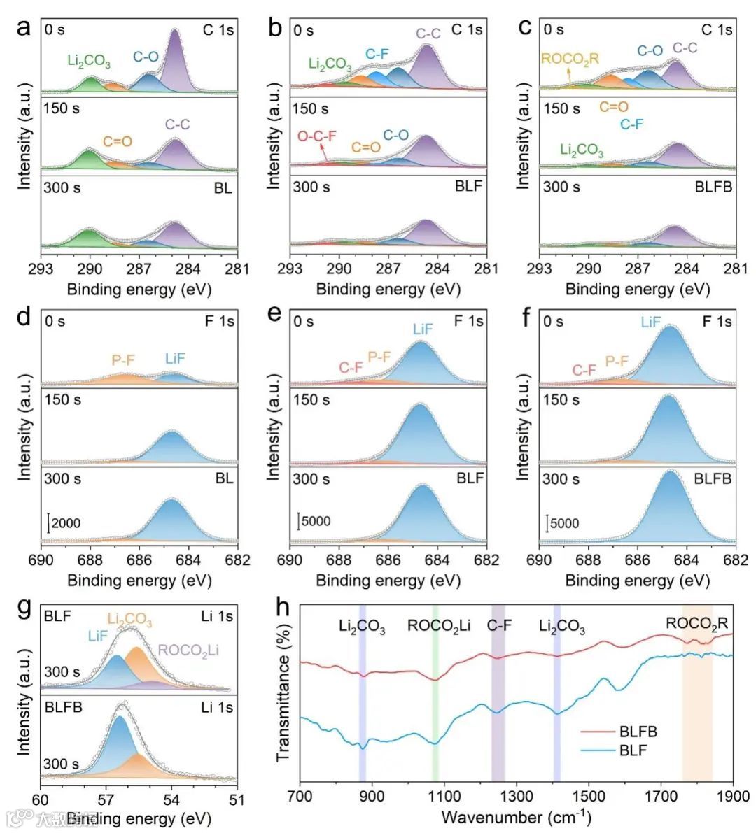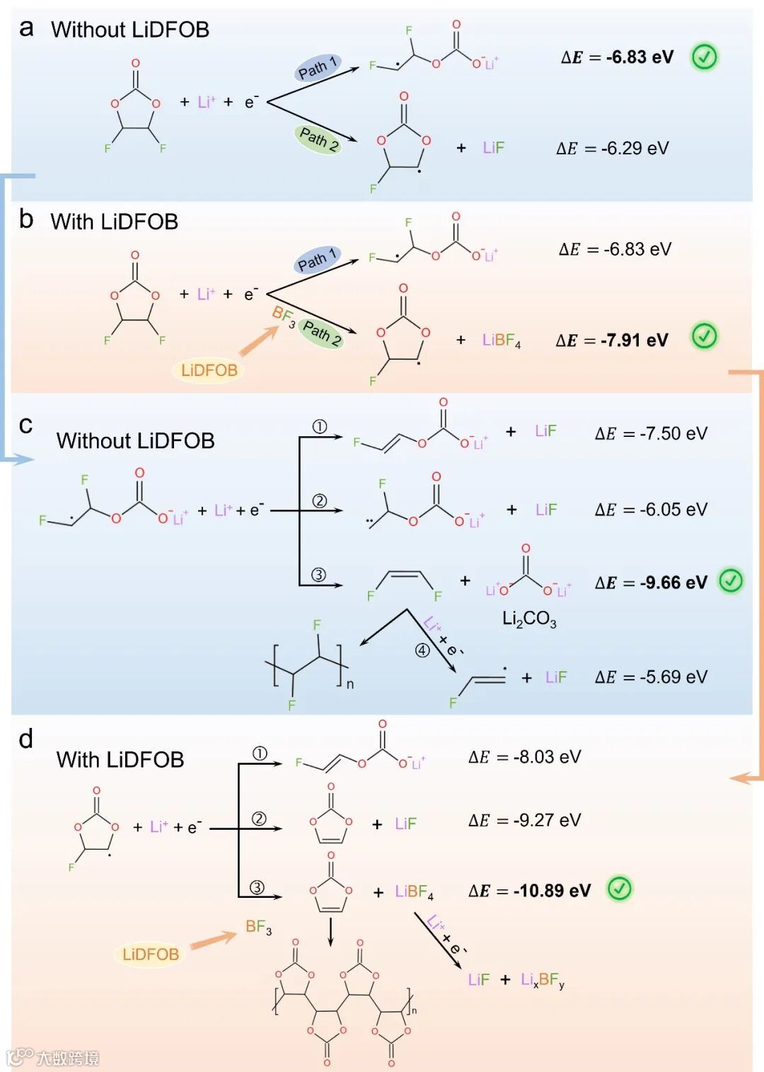 通过计算DFEC潜在分解路径的反应能发现,在LiDFOB存在的条件下,由于其具有最低的LUMO能级,LiDFOB优先发生还原分解,产生高活性BF3物质。在BF3的参与下,DFEC分子的直接脱氟反应在热力学上更优先进行(图2b),释放出F原子,同时保留分子环状结构,从而实现对DFEC分解路径的精准调控。在后续的分解过程中(图2d),DFEC继续发生脱氟反应,产生VC分子和LiBF4,VC分子能够聚合为高弹性的poly(VC)聚合物,而LiBF4又可以进一步分解产生LiF和LixBFy无机物。同时由于反应的同步性,可以推测产生的poly(VC)将与LiF和LixBFy呈现一种交织结构,从而改善poly(VC)离子传导性差的缺点。