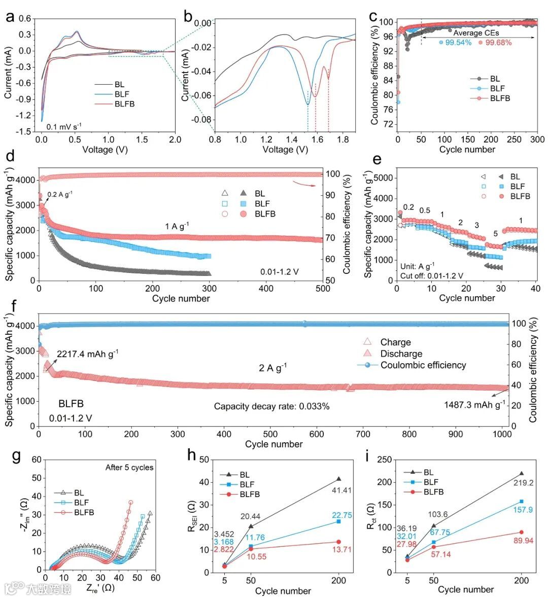 CV测试进一步表明LiDFOB改变了DFEC的分解方式,使得DFEC的分解电位从~1.53 V提前至~1.58 V(图3b)。得益于协同分解机制所产生的独特SEI膜(富LiF并伴随无机-聚合物交织外层结构),硅负极在双添加剂电解液中(BLFB)表现出优异的循环稳定性和倍率性能,其在2 A g-1的电流密度下循环1000次,平均每圈的容量衰减率低至0.033%。