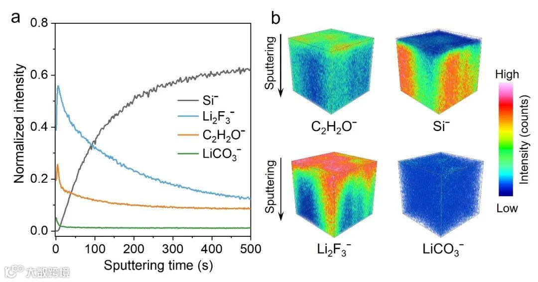 通过XPS、FTIR测试揭示SEI膜的成分结构信息。在双添加剂所生成的SEI膜中检测到大量的LiF物质,而Li2CO3较少,同时在SEI膜外层中检测到poly(VC)聚合物。进一步通过ToF-SIMS表征SEI膜成分结构,LiF在整个SEI膜中含量占比都较高,而poly(VC)有机物只在外层中占比较高,进一步表明其交织结构。