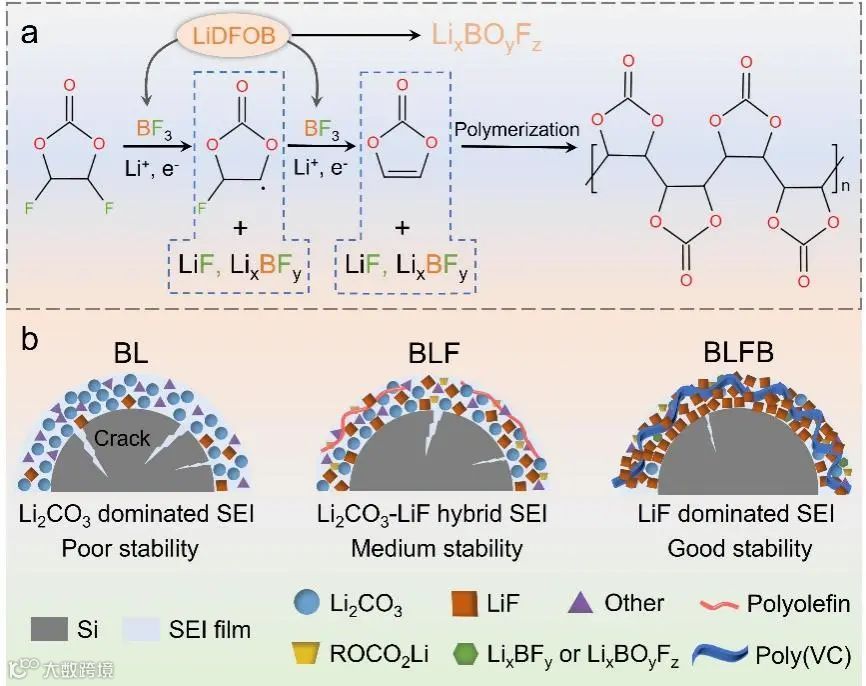 图1. (a)双添加剂协同分解机制示意图,(b)不同硅表面SEI膜成分结构示意图