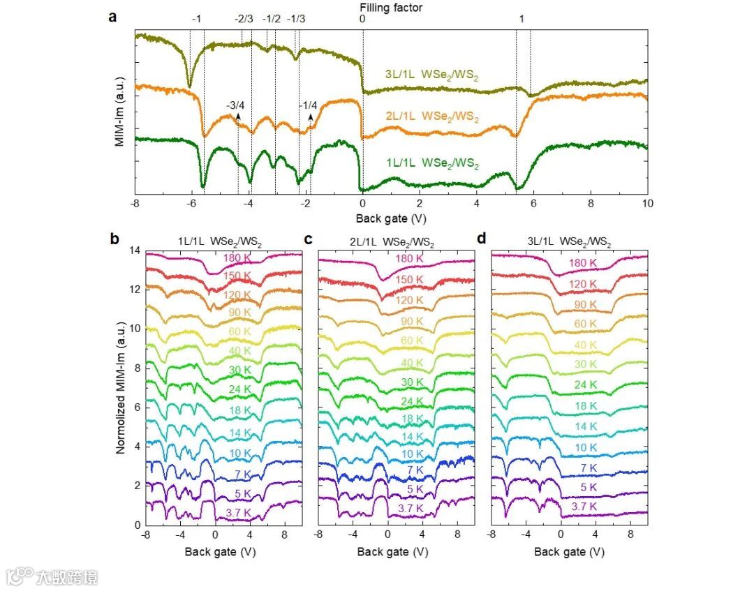 关联电子态对WSe2的层数也具有敏感性。电荷填充为n=-1时的Mott绝缘态的转变温度在1L/1L WSe2/WS2结构中可以维持到180 K,2L/1L WSe2/WS2结构中可以保持到120 K,3L/1L WSe2/WS2结构中可以保持到60 K。电荷分数填充的关联态在3L/1L WSe2/WS2异质结中则明显淬灭(图2)。
