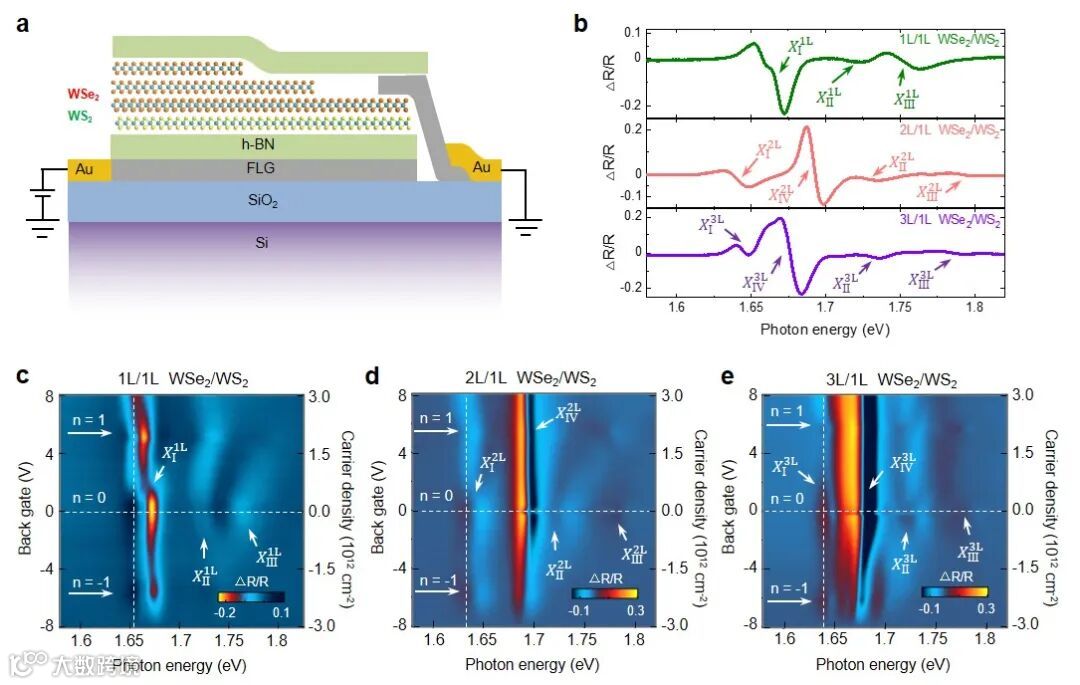 图1. WSe2/ WS2莫尔超晶格异质结示意图,以及不同层数时对应的反射光谱。
