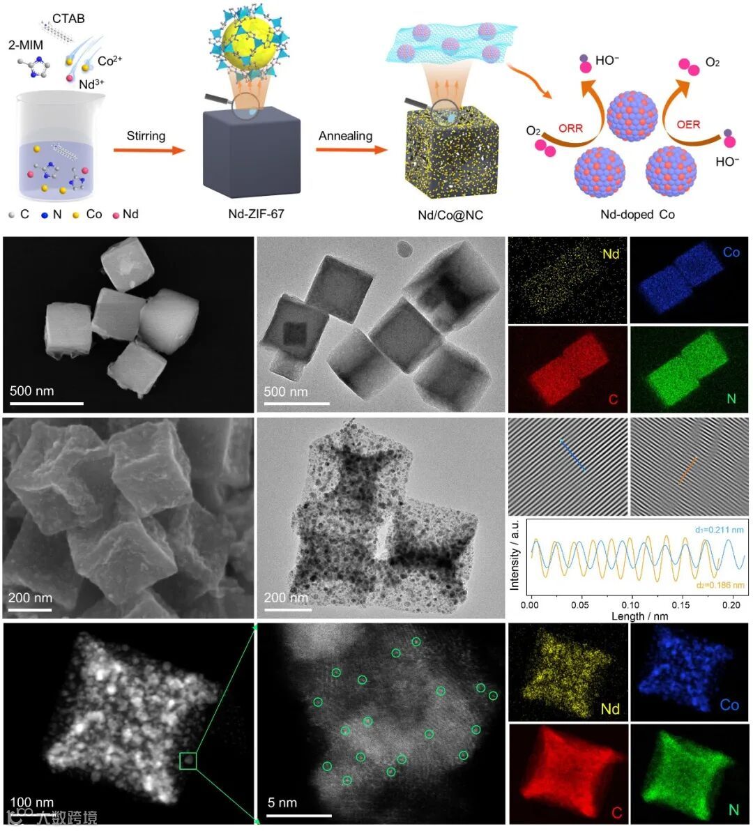 1 不同于先前杂原子掺杂,选用具有独特4f轨道的稀土Nd原子作为杂原子,通过MOF衍生策略构建锚定在N掺杂碳上的原子级Nd掺杂Co位点(Nd/Co@NC),作为一种高效的双功能氧电催化剂。MOF前躯体中带负电荷的有机配体实现了与带正电荷的RE和TM离子的强配位,保证了Nd/Co@NC中Nd和Co的强偶联和Nd的原子级分散。