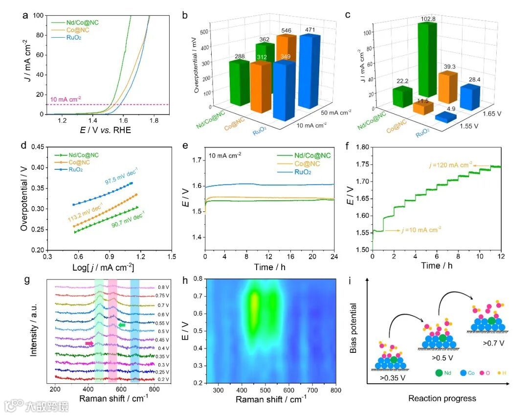 3 原位拉曼光谱揭示了OH−转化为氧中间体的Co-OOH的动态形成过程,随着电位升高,在0.35 V时OH-向*OH和*O等氧中间体的转变。在0.5 V后转化成*OOH而后在足够高的偏置电位下逐渐脱附解吸为O2。相比之下,未掺杂的Co@NC表面氧中间体转化为O2的动力学较为迟缓,证明Nd原子优化Co位点电子结构后促进了OER进程。