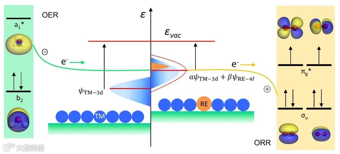 为开发贵金属催化剂的替代品,利用电子调控策略开发过渡金属(TM)催化剂作为氧电催化剂受到了广泛研究。对于过渡金属,杂原子掺杂通过d-d和d-p轨道耦合作用可以扰动原始的d带电子结构,其中d带中心(εd)向费米能级(EF)的相对位移决定了金属-氧共价性。通过调整电子结构,可以打破TM与O结合能的线性关系束缚,使其更接近贵金属基材料,从而表现出良好的氧电催化活性。