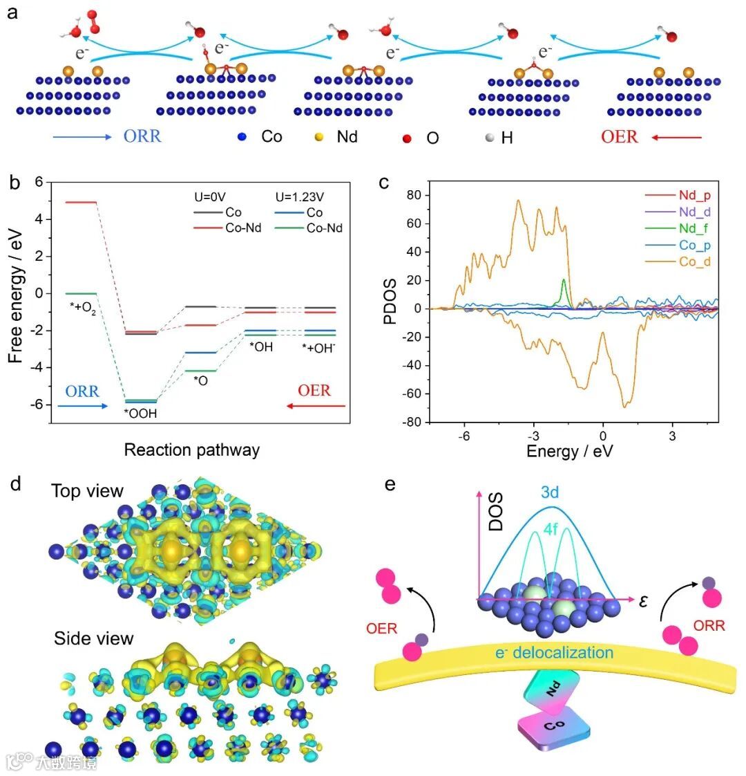 MOF前躯体中带负电荷的有机配体实现了与带正电荷的RE和TM离子的强配位,保证了Nd/Co@NC中Nd和Co的强偶联和Nd的原子级分散。密度泛函理论(DFT)计算表明通过掺杂Nd原子进入Co的表面晶格成功实现f-d轨道耦合,优化了含氧中间体的结合能,平衡了Co的双功能氧电催化活性。