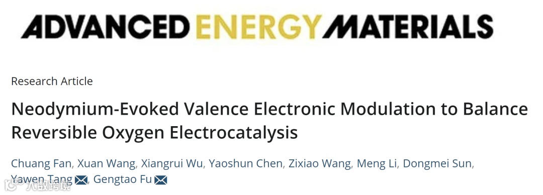 相关成果以标题为“Neodymium-Evoked Valence Electronic Modulation to Balance Reversible Oxygen Electrocatalysis”发表在Wiley出版社旗下材料期刊《Advanced Energy Materials》上。研究生樊闯、王轩为该论文第一作者,付更涛教授、唐亚文教授为共同通讯作者。南京师范大学为唯一单位。
