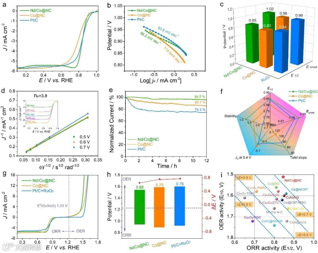 对于ORR过程,在Co@NC表面引入Nd原子大大降低了其决速步从*OOH到*O的跃迁过程中相应的能垒,有效地推动结合能接近最佳ORR活度,从而使Nd/Co@NC表现出极佳的ORR性能。相较于Co@NC样品,Nd诱导Co位点电子重排后的Nd/Co@NC催化剂具有更高的起始电位(1.03 V)和半波电位(0.85 V),甚至优于商业化Pt/C (0.98 和 0.84 V)。同时,它对于ORR还具有更快的反应动力学和电化学稳定性。