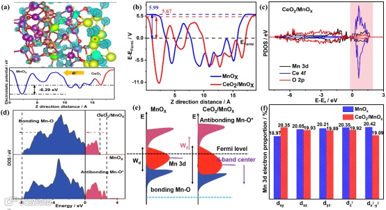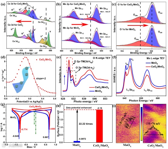 利用X射线光电子能谱(XPS)和XAS对CeO2/MnOx的界面耦合进行了研究。相对于CeO2, CeO2/MnOx的峰值蓝移,表明CeO2/MnOx中Ce的电子缺失。CeO2/MnOx中Mn的峰值红移表明了CeO2/MnOx中Mn中心的电子积累。此外,用CeO2/MnOx (MnOx)电极和碳电极组装了器件,测试了I-V曲线以说明CeO2/MnOx中的强界面耦合效应。进一步,利用Zeta, KPFM评估形成的界面电场强度。