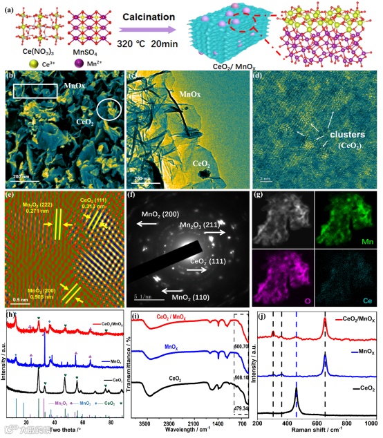 在本工作中,利用煅烧法成功合成了CeO2/MnOx异质结构。并利用多种电镜技术(如SEM、TEM和AC-STEM)对其进行表征。电镜图像清晰地展示了从MnOx的光滑表面到CeO2/MnOx 的粗糙表面的形貌演变过程。这些结果表明,CeO2颗粒以纳米团簇的形式固定在MnOx薄片上,确保了CeO2与MnOx之间充分的接触。此外,利用XRD、FT-IR和Raman等基础物理表征技术对制备的CeO2/MnOx 异质结构进行了分析。这些分析结果证实了在宏观层面上CeO2/MnOx异质结构存在着强烈的界面耦合作用。
