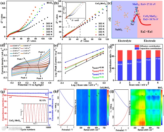 电化学实验及多温度阻抗结果表明,CeO2/MnOx具有更高的比容量以及更优异的动力学性能。进一步结合原位拉曼测试深入探究了其结构演化,并对其稳定性进行了评估,这证实了CeO2/MnOx材料不仅能够增强电荷转移,还能够提高循环稳定性,为进一步开发高性能电极材料提供了可靠的基础。