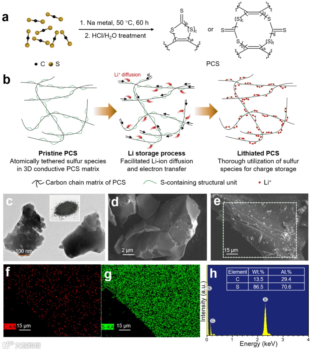 二硫化碳的单体聚合是通过金属钠裂解共价碳硫双键以及再聚合进行(图1a)。聚硫化碳材料中大量的硫原子负责锂离子的储存,其电荷储存机制是电子沿着π共轭导电碳链的三维网络到达硫原子与电解质中扩散的锂离子一起反应(图1b)。