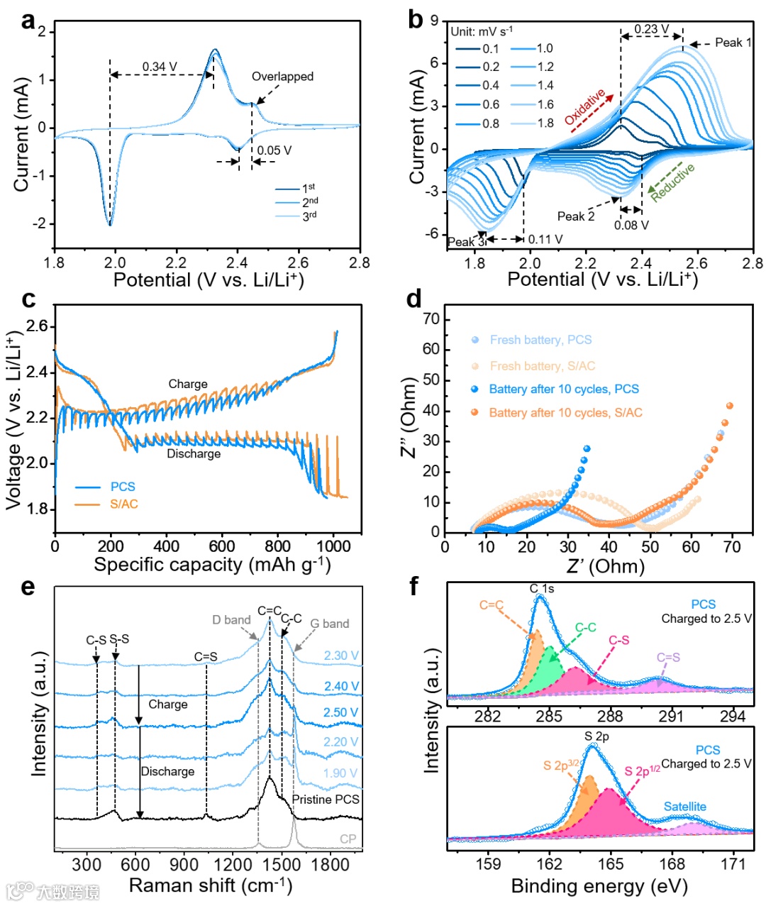 图3. 电化学和非原位光谱分析。(a,b)锂-聚硫化碳电池在(a) 0.1 mV s-1和(b) 0.1, 0.2, 0.4, 0.6, 0.8, 1.0, 1.2, 1.4, 1.6和1.8 mV s-1时的循环伏安曲线。(c)锂-聚硫化碳电池和传统锂-硫电池的恒电流间歇滴定法分析。(d)锂-聚硫化碳电池和常规锂-硫电池在新组装状态和活化后的电化学阻抗曲线。(e)碳纸集流体、制备的聚硫化碳材料和聚硫化碳电极在不同充放电状态下的离地拉曼光谱。(f)在C 1s(上)和S 2p(下)区域充电到2.5 V(vs. Li/Li+)的PCS电极的光电子能谱分析。