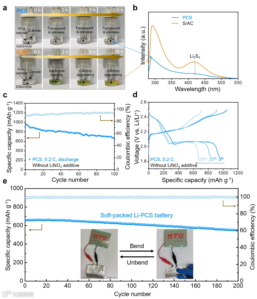 图5. 电池测试。(a)锂-聚硫化碳(上)和锂-硫电极(下)的烧杯电池比较。(b)从循环后的烧杯电池中收集的电解液的紫外-可见光谱。(c)在不添加硝酸锂的二甲醚/乙二醇二甲醚电解液中,在0.2 C条件下的循环测试和(d)锂-聚硫化碳电池的代表性电压曲线。(e) 锂-聚硫化碳电池的连续弯折测试。