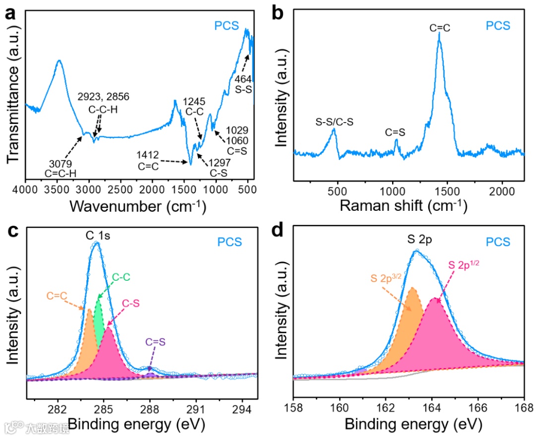 傅里叶变换红外光谱进一步证实了π共轭碳基体中的碳碳单键(图2a)。在1029和1060 cm-1处的峰被证实为碳硫双键。通过拉曼光谱进一步揭示了聚硫化碳材料中原子级组装的硫原子在碳链上的化学键特征(图2b)。聚硫化碳材料的傅里叶变换红外光谱和拉曼光谱中的键振动信号表明碳原子和硫原子之间紧密结合。反卷积X射线光电子能谱也进一步证明了聚硫化碳中碳硫化学键合作用,进一步验证了聚硫化碳的结构特征(图2c,d)。