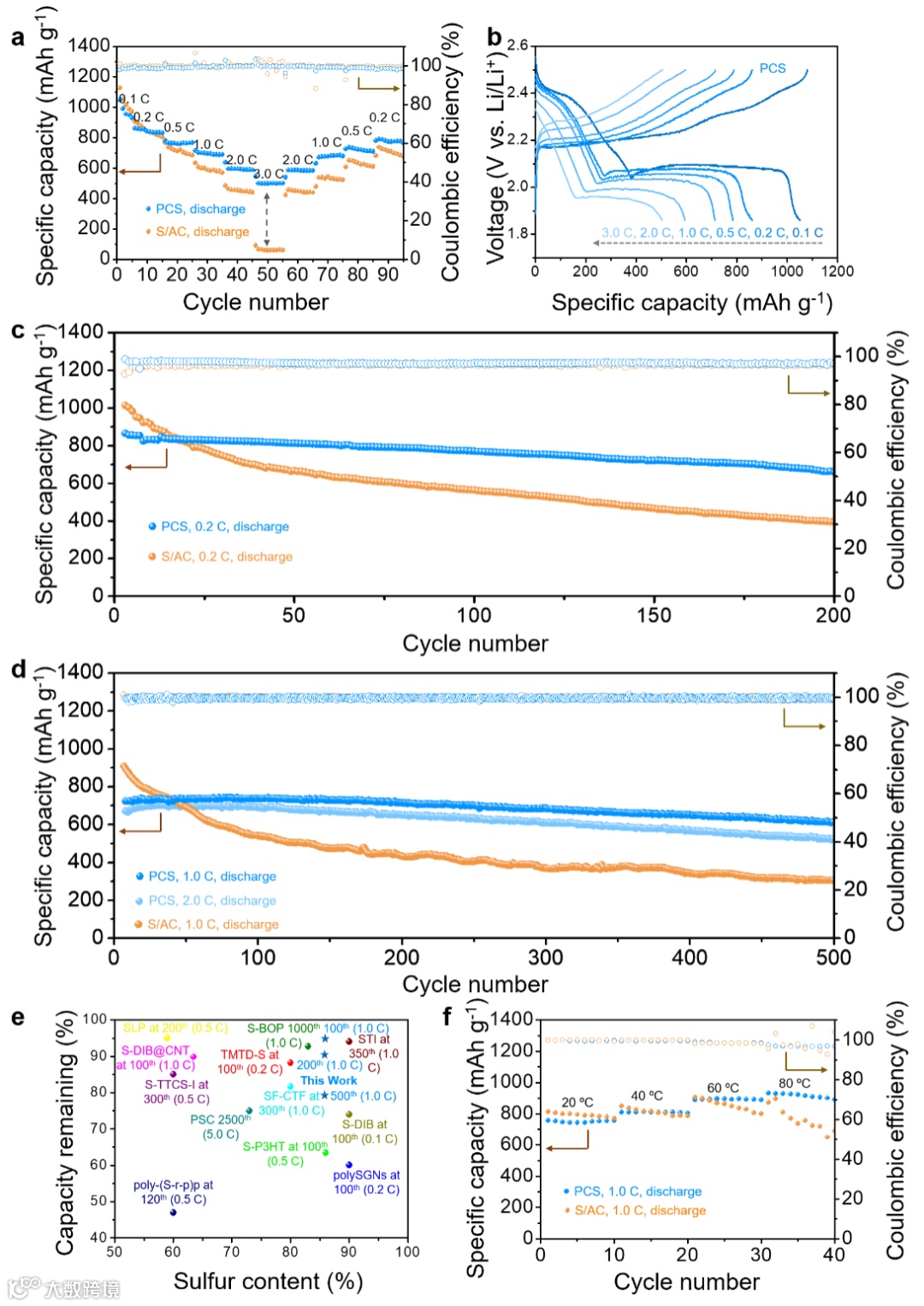 高负载试验证明了聚硫化碳电极的长期稳定性和大规模应用潜力。从硫含量、耐久性和容量保持等方面来看,这种优异的电化学性能在之前报道的硫复合材料中具有明显竞争力(图4e)。聚硫化碳材料的坚固结构和热耐久性通过在高温下循环进一步得以证明,这在很大程度上归因于聚硫化碳的碳和硫原子之间的牢固结合结构(图4f)。