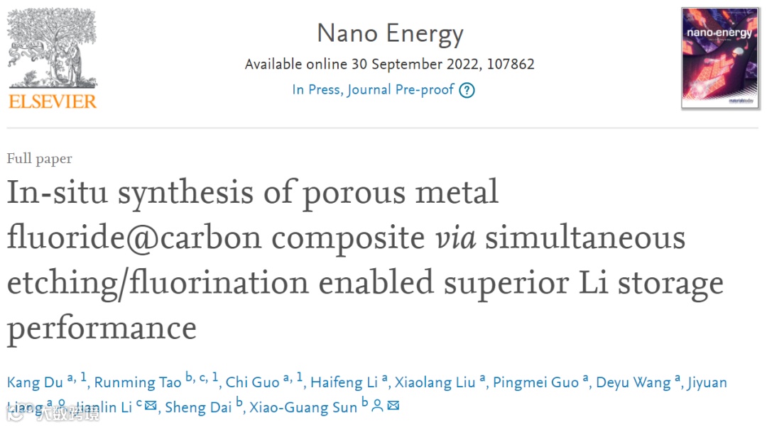 基于此,江汉大学梁济元博士与橡树岭国家实验室Xiao-guang Sun等人在国际知名期刊Nano Energy发表题为“In-situ synthesis of porous metal fluoride@carbon composite via simultaneous etching/fluorination enabled superior Li storage performance”的研究论文。该论文第一作者为江汉大学硕士研究生杜康。