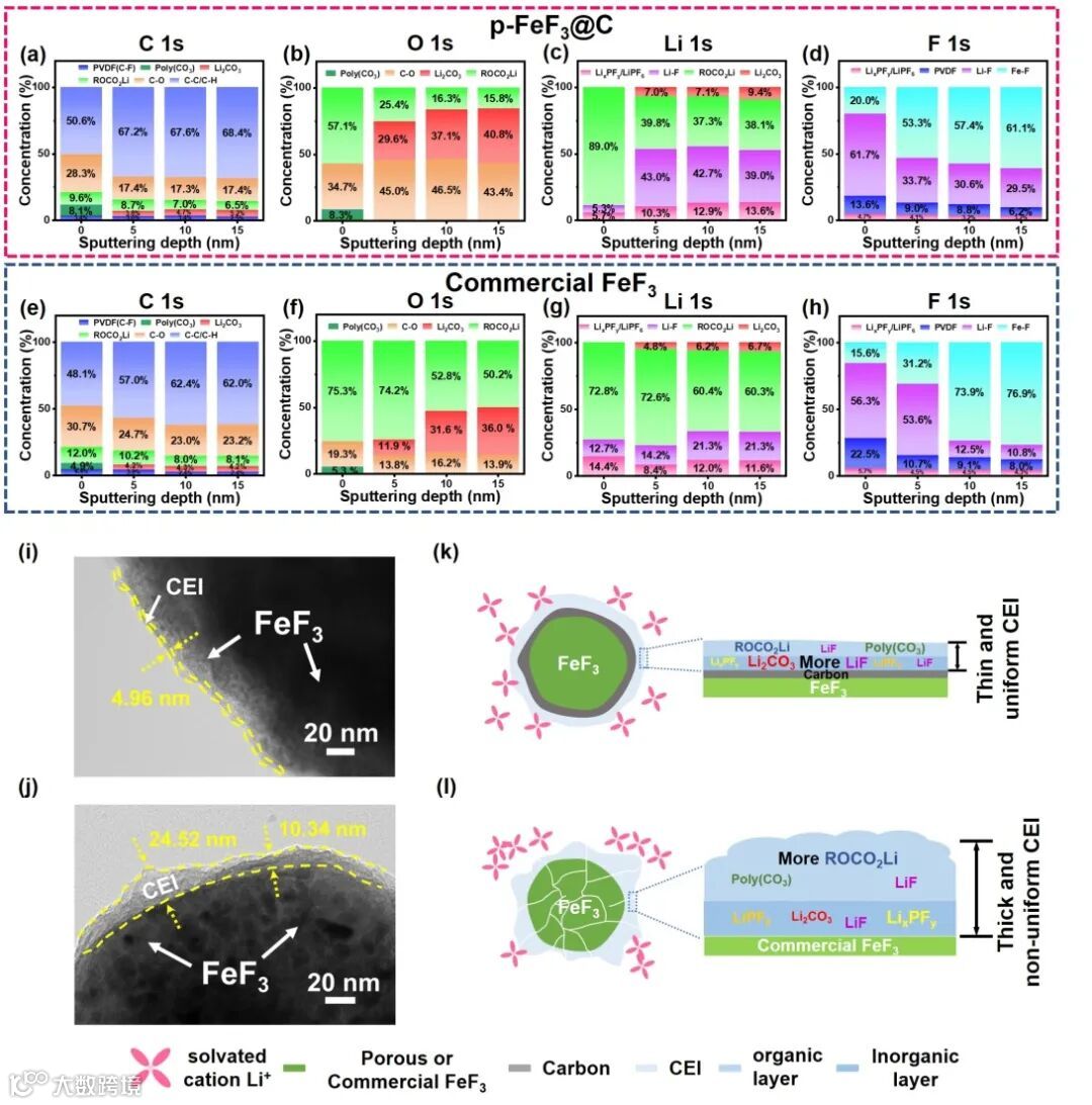 通过对循环后的电极进行不同刻蚀深度的XPS分析,结果表明p-FeF3@C正极和商业FeF3正极都具有内层为无机层,外层为有机层的CEI结构。其中p-FeF3@C正极的CEI有机层厚度比商业FeF3正极更薄,而占无机层主要成分的Li2CO3和LiF的含量更高,这有助于控制Li+的均匀传输,防止了电解液的持续分解,构筑更加均匀且致密的CEI膜。此外,对CEI主要成分的含量进行了详细的统计分析,结果和上述分析相吻合(图2a-h)。