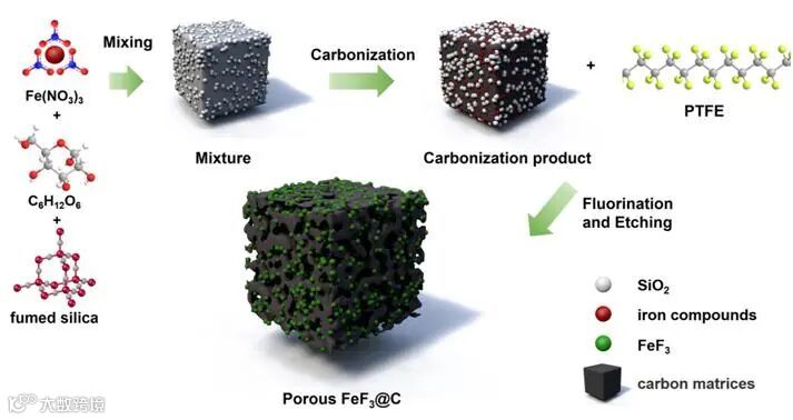 这项工作通过将二氧化硅与金属盐前驱体和葡萄糖球磨并碳化后,与聚四氟乙烯微粉混合进行二次碳化,从而得到具有多孔结构的氟化铁-碳复合材料。由于多孔结构具有较短的锂离子扩散距离,从而有利于改善电极材料的倍率性能;碳复合又改善了材料的导电性,同时缓解了充放电过程中过渡金属氟化物体积膨胀问题,从而有利于稳定性提升。