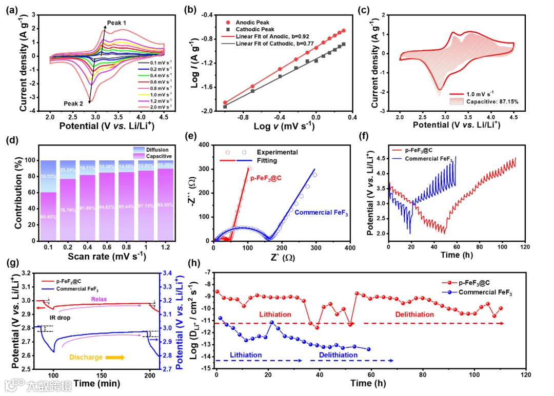 由于多孔结构增大了活性物质的表面积(增加了其表面的活性位点数量),有利于锂离子的快速传输,有助于增强其倍率性能(图3a-d)。奈奎斯特图可以看出p-FeF3@C正极的RCEI和Rct的总和明显低于商业FeF3正极,说明复合材料降低了界面电阻,反应动力学大大加快(图3e)。GITT的测试结果更直观地说明了p-FeF3@C正极具有比商业FeF3正极更加快速的Li+扩散速率,电化学反应动力学更快(图3f-h)。