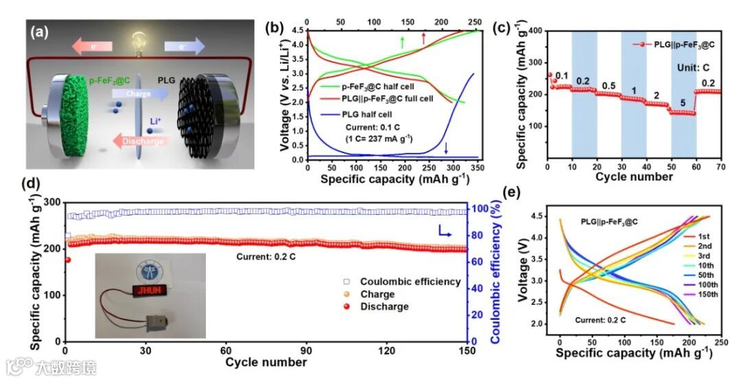 为了验证p-FeF3@C电极的商业化价值,将其与石墨负极组装成全电池做出了电化学性能测试。结果表明,锂化石墨(PLG)||p-FeF3@C全电池在液态电解质中显示出良好的倍率性能和循环稳定性,经过150次循环后显示出94.7%的高容量保持率和97.8%的平均库仑效率(图4)。
