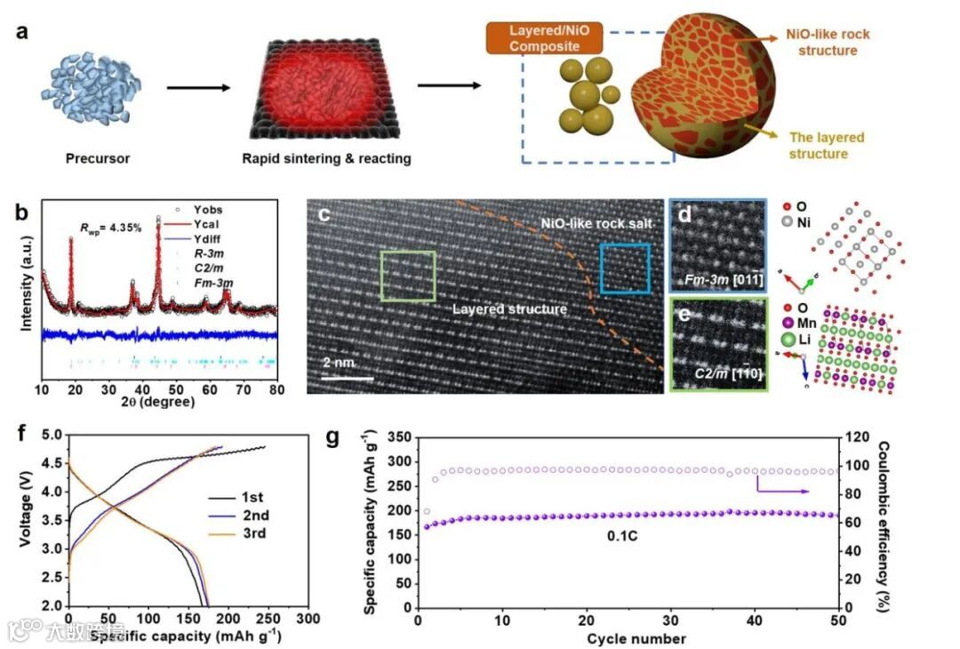 图5. HTS合成的富锂层状氧化物/氧化镍异质结构材料的结构表征及电化学性能。