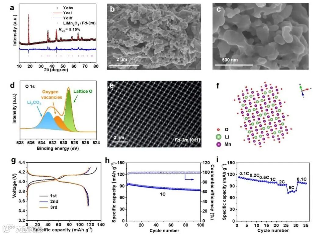 XPS的结果证实了合成的LiMn2O4正极材料存在氧空位。这些氧空位是由于HTS过程中的高的升温速率和短的煅烧时间产生的(图3d)。根据之前的报道,氧空位有利于Li+的扩散和并且提高正极材料的电化学性能。此外,HAADF-STEM的结果也证实了典型尖晶石相的存在(图3e, f)。