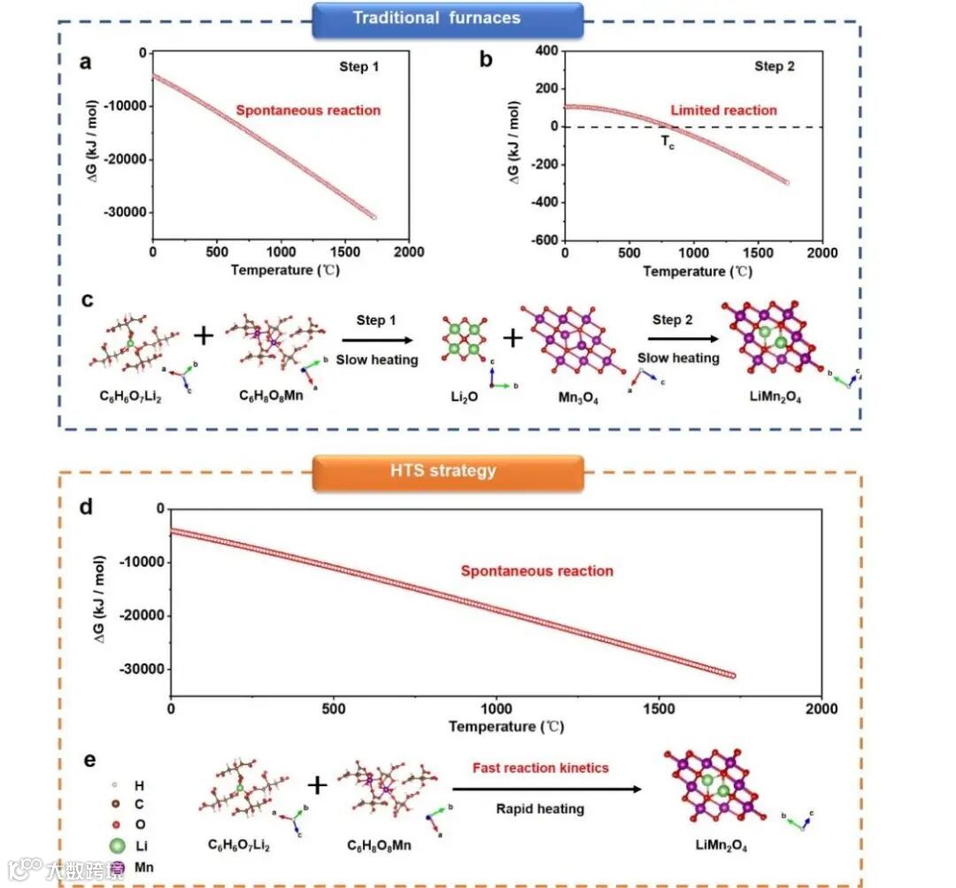 第一性原理计算被使用去深入了解LiMn2O4在HTS和传统合成过程中的形成机制的差异,对于传统的合成,这里存在着一个两步的反应过程。在步骤1中,前驱体被转化为中间产物,其中包括Li2O和Mn3O4。在这个过程中,ΔG在整个温度范围内是负的,表明是自发反应(图2a,c)。而在步骤2中,随着温度的升高,ΔG由正转负,其中Li2O和Mn3O4被转变成LiMn2O4。有趣的是,在步骤2中显示了一个临界温度(Tc),表明一旦温度达到Tc,反应将不可逆转地进行(图2b,c)。