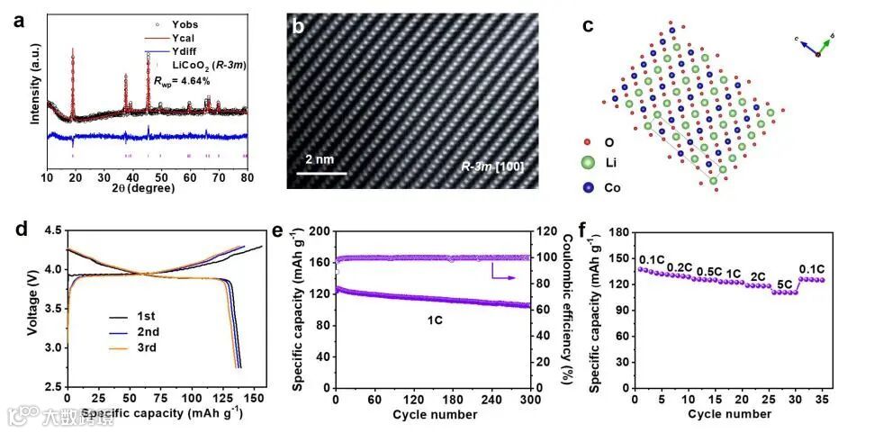 图4. HTS合成的LiCoO2的结构表征及电化学性能。