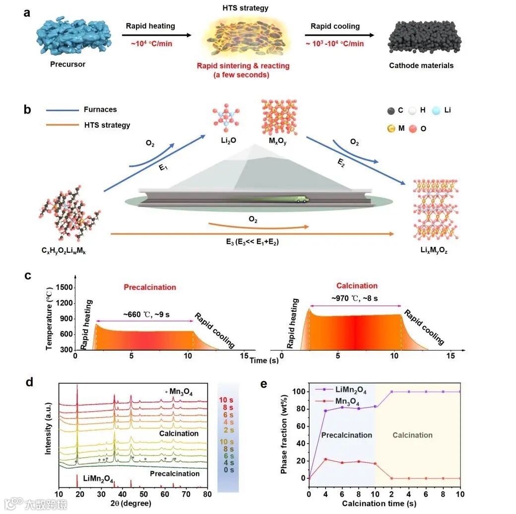 本工作报告了一种超快速的高温热冲击(HTS)策略通过非平衡反应去合成正极材料。在这个过程中,高的升温速率(~104 ℃/分钟)、高的煅烧温度、高的冷却速率(~103-104 °C/分钟)以及快速反应动力学可以同时被实现(图1a)。与需要长时间热处理和多步反应的传统合成方法相比,HTS的非平衡特征使得整个过程呈现一步反应机制并且在数秒钟内就可以合成正极极材料(图1b)。