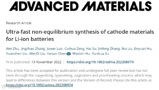 Ultra-fast non-equilibrium synthesis of cathode materials for Li-ion batteriesAdvanced Materials ( IF 32.086 ) Pub Date : 2022-11-19 , DOI: 10.1002/adma.202208974Wei Zhu,Jingchao Zhang,Jiawei Luo,Cuihua Zeng,Hai Su,Jinfeng Zhang,Rui Liu,Enyuan Hu,Yuanshen Liu,Wei-Di Liu,Yanan Chen,Wenbin Hu,Yunhua Xu
