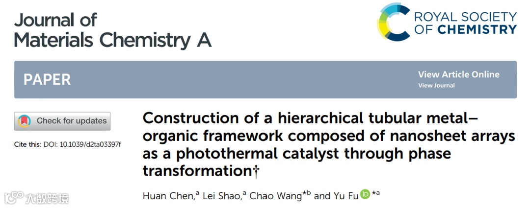 基于此,来自东北大学的付昱教授与沈阳药科大学的王超教授合作,在国际知名期刊Journal of Materials Chemistry A上发表题为“Construction of hierarchical tubular metal-organic framework composed of nanosheet arrays as photothermal catalyst through phase transformation”的文章。该文章利用不稳定的MOF的相的转变,实现具有光热转化性能的多级管状结构的Cu-MOF-74的构建,并将其作为光热催化剂,用于光能驱动的CO2的固定。