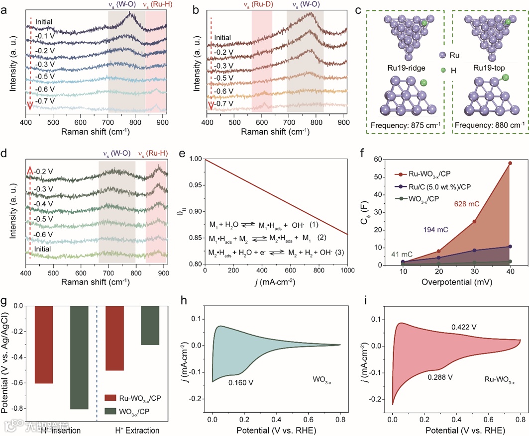 图4 (a)1.0 M PBS溶液中采集的Ru-WO3-x/CP在-0.1至-0.7 V(vs. Ag/AgCl)电压范围内的原位拉曼光谱。(b)1.0 M PBS(D2O为溶剂)溶液中采集的Ru-WO3-x/CP在-0.2至-0.7 V(vs. Ag/AgCl)电压范围内的原位拉曼光谱。(c)用于Ru-H振动拉曼频率计算的DFT模型的侧视图和俯视图。(d)1.0 M PBS溶液中采集的Ru-WO3-x/CP在-0.6至-0.2 V(vs. Ag/AgCl)电压范围内的原位拉曼光谱。(e)从微动力学分析获得的θH与电流密度的函数。(f)在1.0 M PBS中,不同催化剂在HER期间的不同过电位下的Cφ拟合数据。(g)Ru-WO3-x/CP和WO3-x/CP的H+插入和脱出过程的起始电位。(h)WO3-x在1.0 M PBS中的CV曲线。扫描速率:5 mV s-1。(i)Ru-WO3-x在1.0 M PBS中的CV曲线。扫描速率:5 mV s-1。