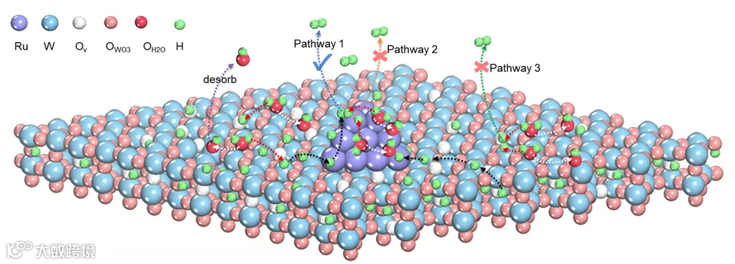 进一步地,利用DFT对Ru-WO3-x表面的反应路径进行了详细计算。结果表明:相比于单独的WO3-x,Ru的负载使得WO3-x体系中的质子从WO3-x溢流至Ru表面更为容易。此外,对反应路径的计算揭示了WO3-x表面的质子转移至Ru表面进行Heyrovsky反应的路径是最为有利的。
