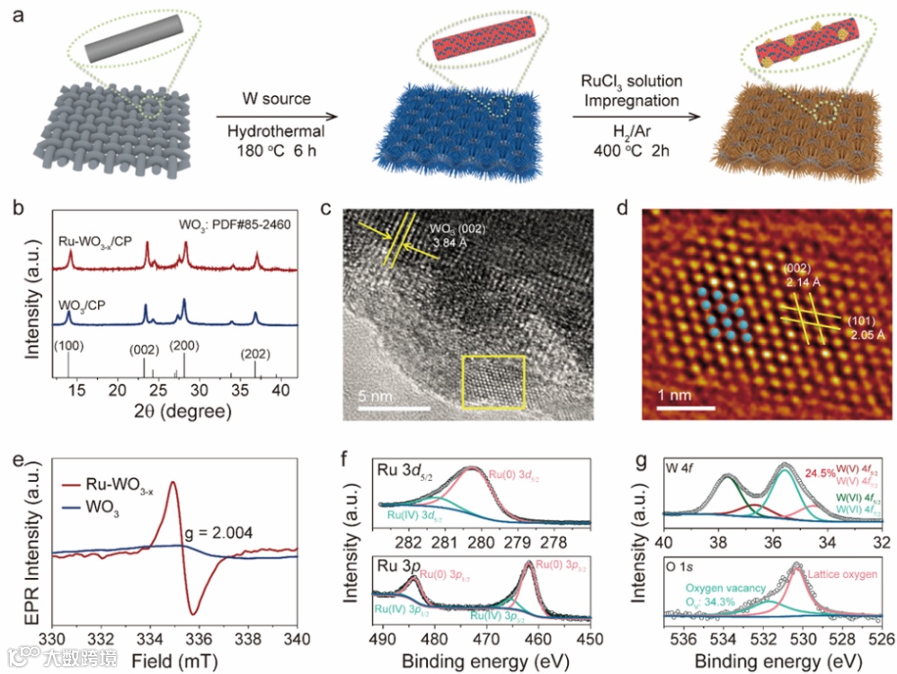 图2 (a)Ru-WO3-x/CP的制备过程示意图。(b)WO3/CP和Ru-WO3-x/CP的PXRD图谱。(c)Ru-WO3-x/CP的HRTEM图像。(d)使用ASBF过滤器过滤处理后的HRTEM图像以及相应结构模型,蓝色球体代表Ru原子,此处图像为(c)图中Ru-WO3-x/CP所标记的Ru NPs区域。(e)WO3和Ru-WO3-x的EPR光谱。(f)Ru-WO3-x/CP的Ru3d5/2和Ru 3p的XPS谱。(g)Ru-WO3-x/CP的W 4f和O 1s的XPS谱。