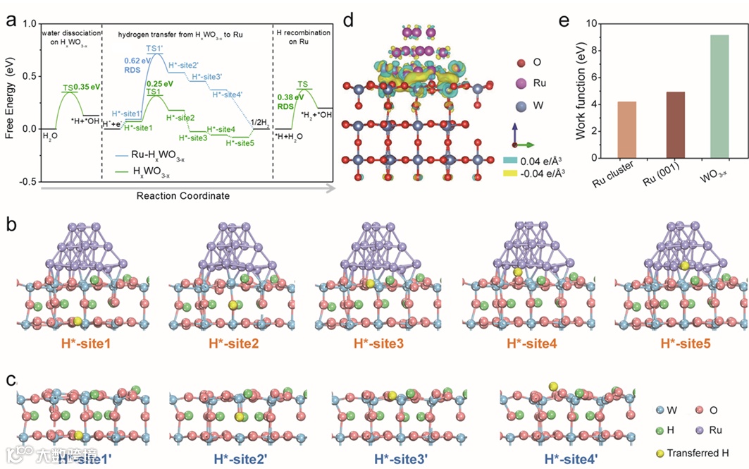 图5 (a)Ru-HxWO3-x和HxWO3-x上的氢转移过程自由能变化图。(b)Ru-HxWO3-x和(c)HxWO3-x不同位点上优化后的H*吸附结构。(d)Ru-WO3-x界面的电荷密度差分图。电子聚集和排斥分别用黄色和蓝色表示。(e)各种Ru和WO3-x的功函数。
