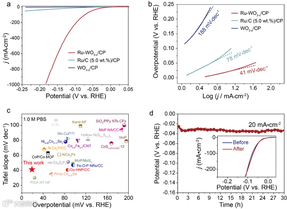 图3 (a)不同催化剂的LSV曲线。(b)相应的塔菲尔曲线图。(c) Ru-WO3-x/CP与文献报道的催化剂的性能比较。(d)Ru-WO3-x/CP在20 mA cm-2电流密度下记录的计时电位曲线。插图为稳定性测试前后的LSV曲线。