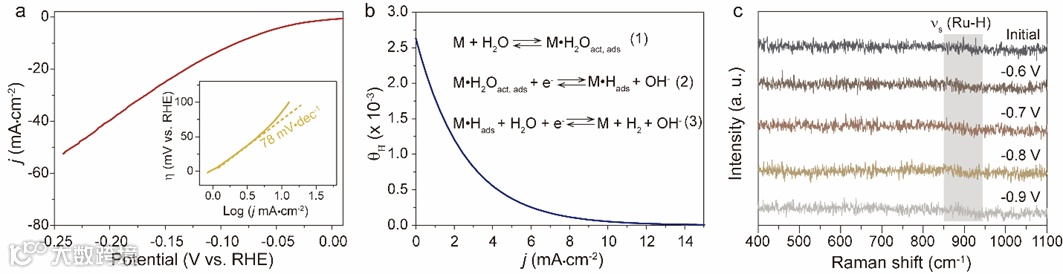 图1 (a)负载在CP上的商业Ru/C (5 wt.%)的LSV曲线和相应的Tafel图。扫描速率:2 mV s-1。(b)从微动力学分析获得的θH与电流密度的函数。微动力学模型的建立基于图中的三个基元反应。(c)在1.0 M PBS中,Ru/C (5 wt.%)在-0.5 V至-0.9 V(vs. Ag/AgCl)的电位范围内的原位拉曼光谱。