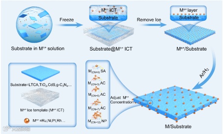 冰模板方法简单通用,只需要将光催化剂载体(如 LTCA、TiO2、CdS和g-C3N4)分散到含有金属阳离子(Mn+)的前驱体溶液中,然后通过液氮快速冷冻形成含有Mn+的冰模板。通过真空冷冻干燥技术去除冰模板后,Mn+就能均匀地吸附在载体表面。在Ar/H2混合气氛下煅烧 Mn+/基底,最终完成金属催化剂的负载。只需要改变前驱体溶液中Mn+的浓度,就可以得到不同形式的助催化剂,如单原子、不同配位数的原子团簇和纳米颗粒。