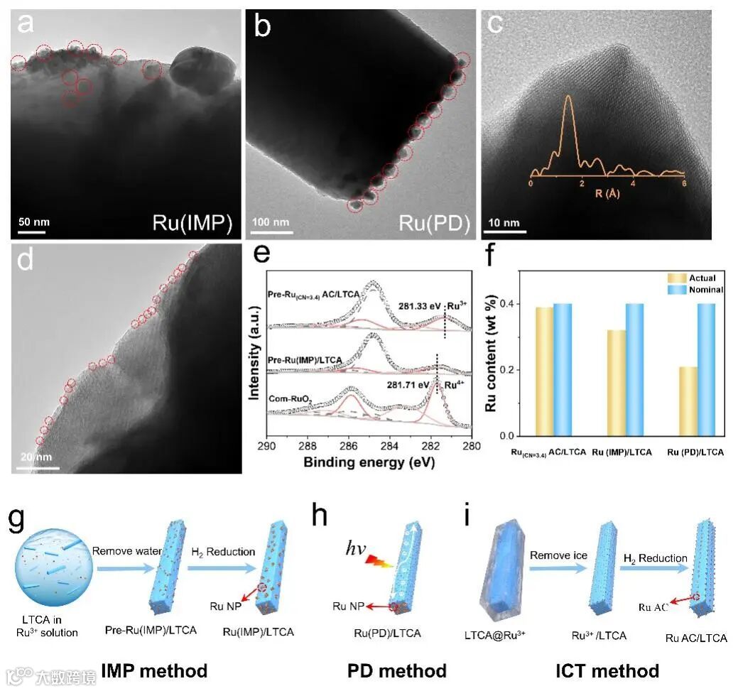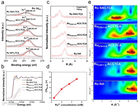 近日,东华大学罗维和肖琪教授团队在国际顶尖期刊Advanced Materials上发表题为“Ice-templated Synthesis of Atomic Cluster Cocatalyst with Regulable Coordination Number for Enhanced Photocatalytic Hydrogen Evolution”的研究论文。该研究在可控制备原子团簇助催化剂上实现了新突破。研究人员以冰为模板,发展了一种通用的助催化剂合成方法,实现了从单原子、原子团簇到纳米颗粒的尺寸控制,更重要地是,修饰的助催化剂的配位数也是可控的。该策略还可以拓展到各种金属(如 Ni、Rh、Pt 和 Ru)和各种光催化载体(如TiO2, g-C3N4, CdS和LTCA),证实了冰模板方法的通用性。此外,结合高分辨透射、XPS和同步辐射硬线光谱等表征技术,首次揭示了冰模板法合成助催化剂的形成机制,与传统浸渍法和光沉积法相比,冰模板法在尺寸可调和配位数可控上展现出独特的优势,同时,也能够更好的避免助催化剂金属的浪费,在原子经济效益上展现出更大的效益。以LTCA光催化剂为例,在LTCA上制备了配位数可调的Ru助催化剂,其中Ru(CN=3.4) AC/LTCA在可见光下展现出最优的光催化产氢活性(578 μmol h-1),原位XPS光谱结果表明富电子Ru位点促进了光催化产氢。DFT理论计算也证实了Ru(CN=3)原子团簇具有最优的电子特性和产氢活性。