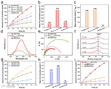 在可见光下的光催化产氢测试表明,相对于Ru单原子和纳米颗粒,Ru原子团簇助催化剂展现出更优的产氢活性。其中,Ru(CN=3.4) AC具有最优的光催化活性(578 μmol h-1),优于已报道的大部分催化剂。原位XPS测试证实了富电子Ru位点促进了光催化产氢活性,Pt/Rh/Ni AC也展现出优异的光催化产氢性能。