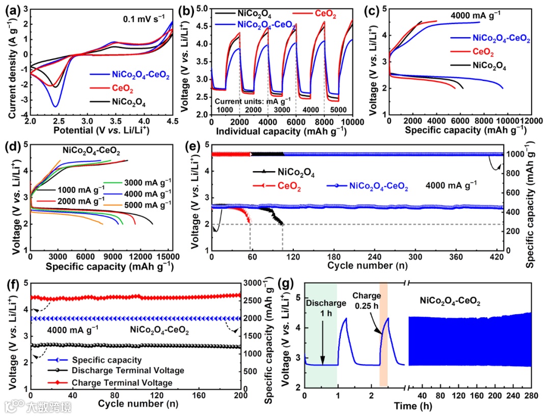 以NiCo2O4-CeO2为阴极组装成电池以评价BIEF对电池性能的提升作用。结果表明,在4000 mA g−1的大电流密度下,NiCo2O4-CeO2阴极的放电容量高达9546 mAh g−1,远高于NiCo2O4(6206 mAh g−1)和CeO2(5538 mAh g−1)阴极。在1000 mAh g−1的限定容量下,NiCo2O4-CeO2阴极的过电位(1.10 V)显著低于NiCo2O4(1.22 V)和CeO2(1.37 V)阴极,且能稳定循环430次。即使在限定容量2000 mAh g−1的条件下,NiCo2O4-CeO2阴极也可以稳定循环200次以上。