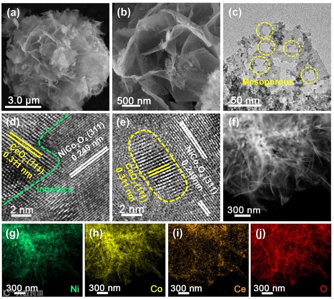 图1. NiCo2O4-CeO2材料的(a, b)SEM图,(c)TEM图,(d, e)HRTEM图,(f-j)HAADF-STEM图及相应的EDS图。