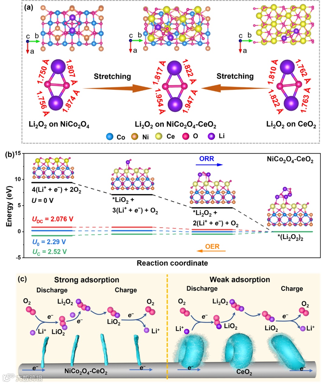 图4.(a)Li2O2吸附在NiCo2O4、CeO2和NiCo2O4-CeO2表面上的示意图以及相应的Li−O键的键长比较;(b)基于(Li2O2)2团簇在NiCo2O4-CeO2上的成核/分解计算的ORR/OER过程的自由能图;(c)Li2O2的形成机制示意图。