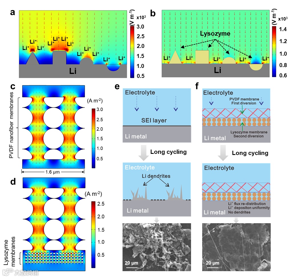 通过电荷密度模拟,对不同形态(三角形、半圆形、矩形)锂芽的吸附,结果证实溶菌酶膜降低了电场强度。通过电流分布与变形几何的耦合证实溶菌酶膜的柱状纳米孔可以对锂离子通量进行二次分布。PVDF膜首先将锂离子流分流,然后锂离子流在通过多孔溶菌酶膜时进行二次均匀分流,实现了Li+的均匀沉积。
