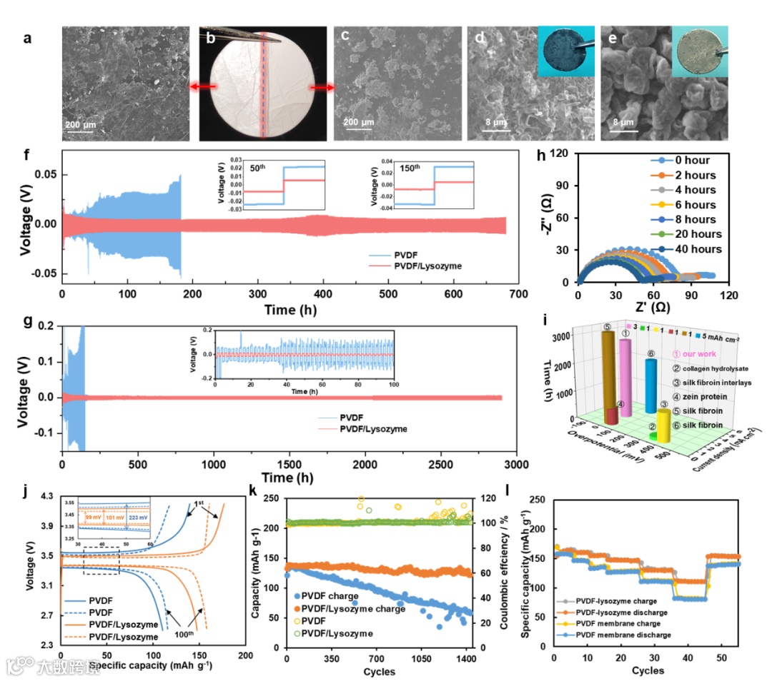 通过同步辐射小角散射表征和物理场的耦合计算,大孔PVDF纳米纤维膜和柱状纳米孔溶菌酶膜促进了锂离子浓度在金属锂表面的均匀分布。通过溶菌酶修饰,实现了Li-Li对称电池(2800小时)和Li-LiFePO4全电池(1450循环)的高稳定性