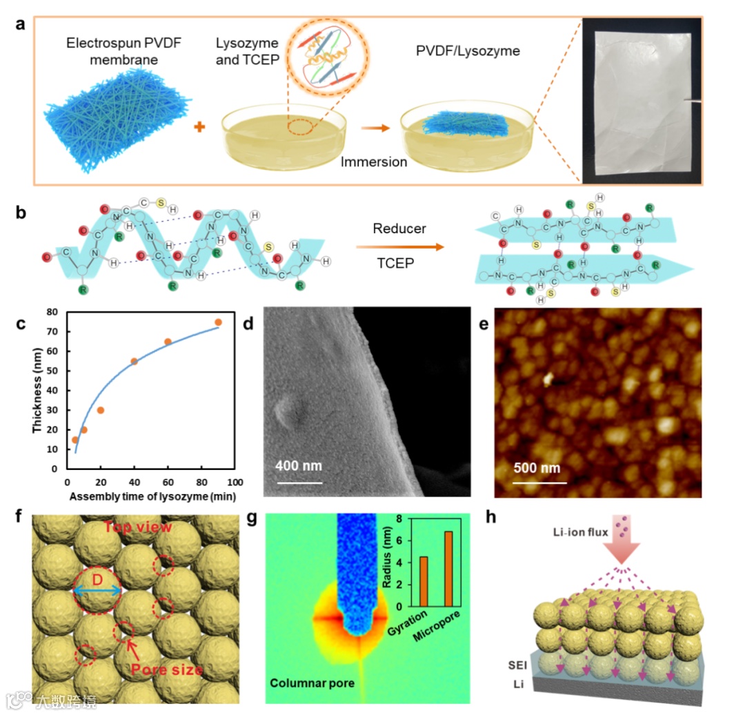 研究者通过将PVDF静电纺丝膜和相转变溶菌酶蛋白膜(PVDF/Lysozyme)相结合,合理设计和制造了具有高机械强度和均匀锂离子通量的功能性改性层。发现具有β-折叠构象且含有高亲理性巯基的超薄溶菌酶膜经历超限锂电镀/剥离仍有效抑制锂金属与电解质的不良反应。溶菌酶膜修饰的金属锂界面具有较高的机械强度和Li+结合能,其弹性模量是其它蛋白的5倍,巯基极性基团对锂的吸附能是常规肽键的1.6倍。
