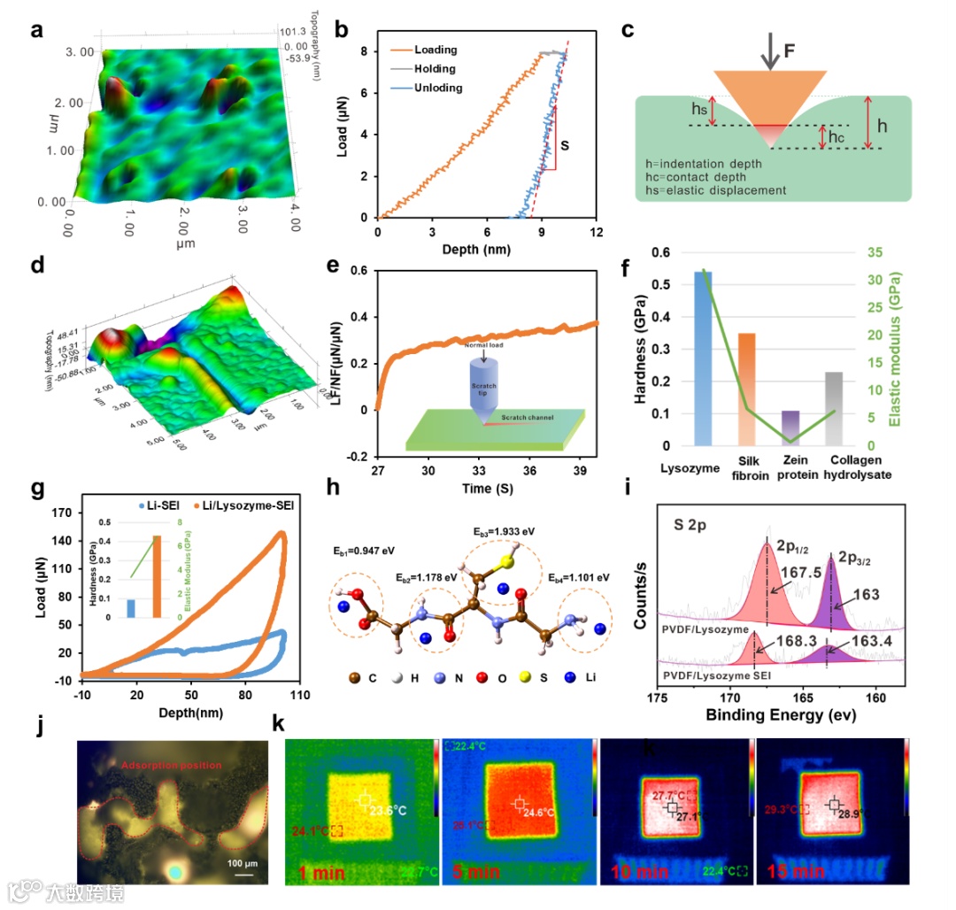 通过纳米压痕/划痕、荧光显微镜、吸附能计算等研究发现:8 μN载荷下溶菌酶的硬度和弹性模量分别为0.54和31.88 GPa,高于目前报道的蛋白材料,且溶菌酶修饰的SEI膜的硬度和弹性模量分别为0.43和6.87 GPa。锂与四个主要基团(即肽、羧基、氨基和巯基)的结合能分别为1.178 eV、0.947 eV、1.101 eV和1.933 eV,巯基对锂的吸附能最高。